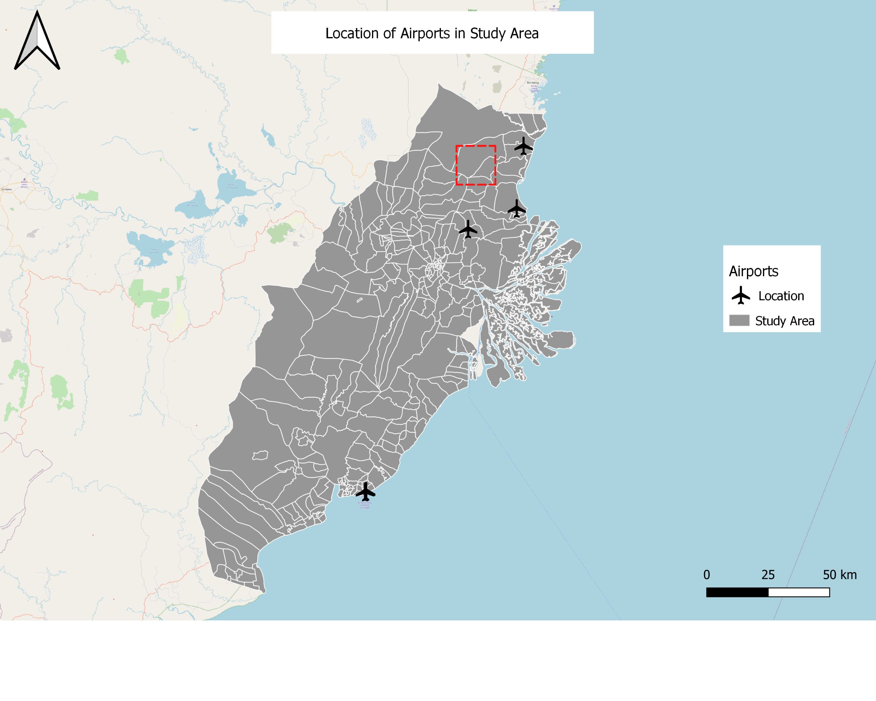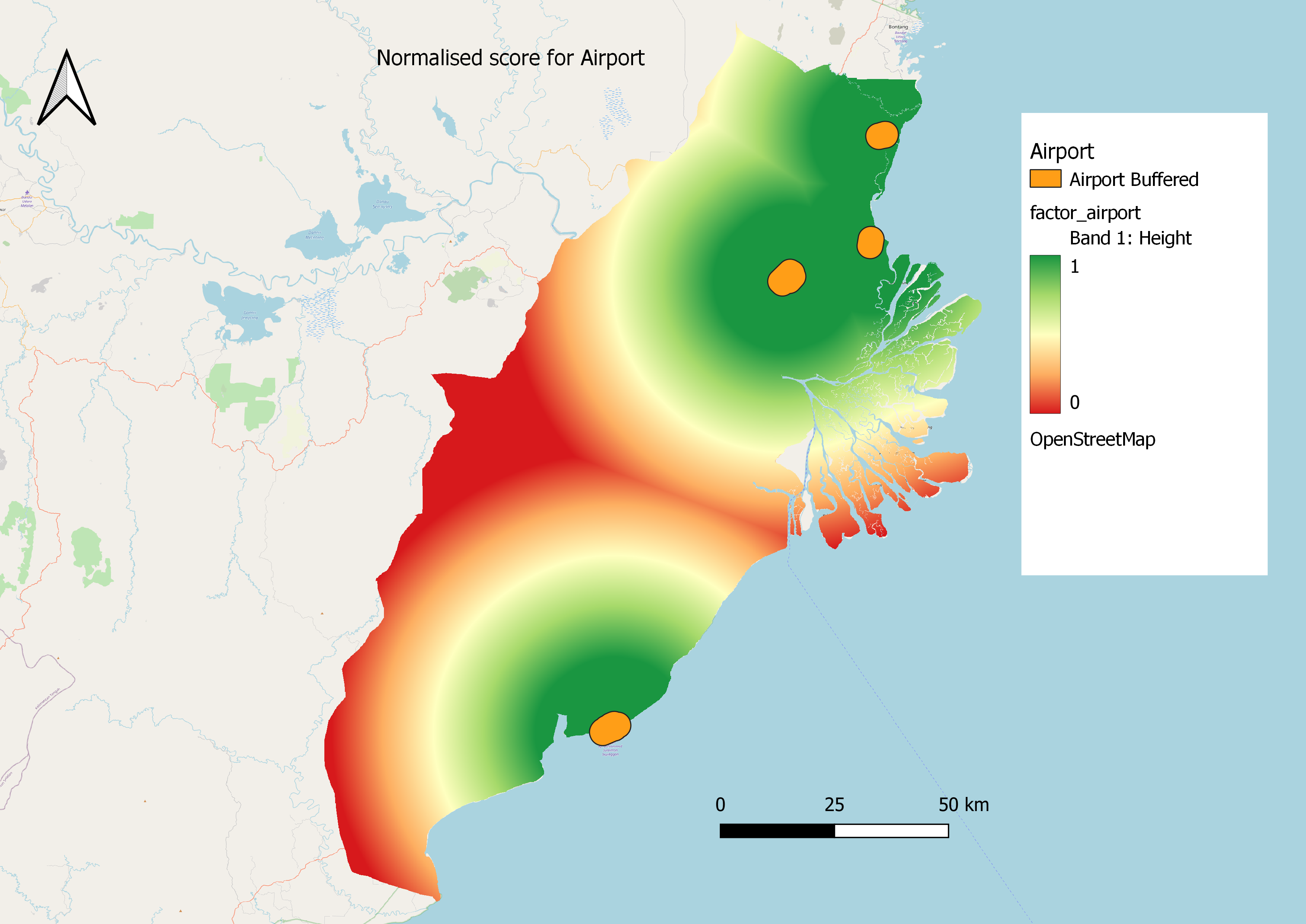 A 3km buffer was constructed outside of the airport to account for noise abatement limitations. Even so, most of the study area near the coastal areas are highly accessible to airports, with the exception of the area exactly between Balikpapan and Samarinda. The South of the study area has access to only one airport (Balikpapan Airport) while there are 3 airports in the north. Further research and surveys done in task 1 found that 2 of those 3 airports are either decommissioned or very lightly utilised. However, they could still be refurbished without incurring excessive capital expenditure if the situation calls for it, instead of contructing a new airport.