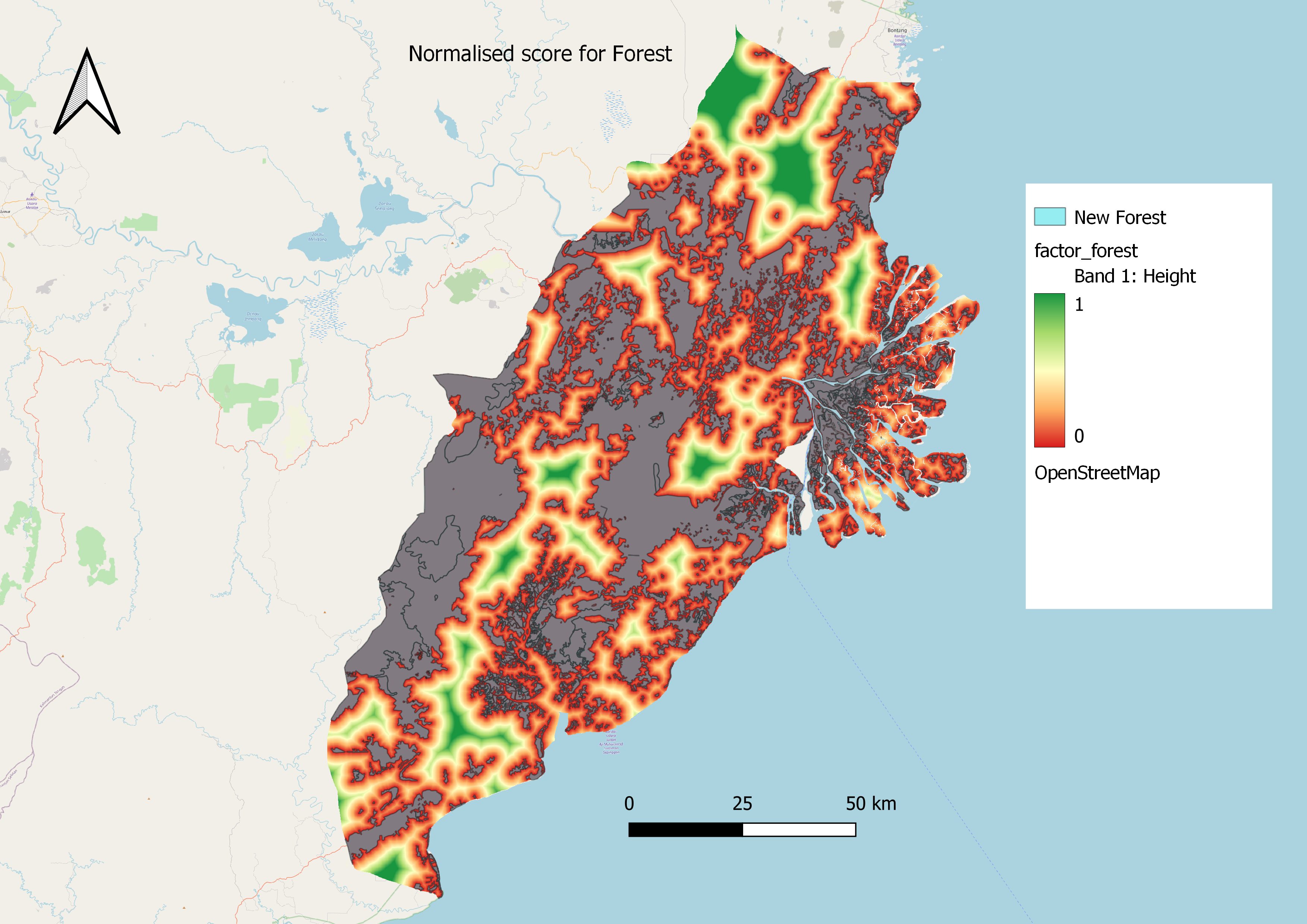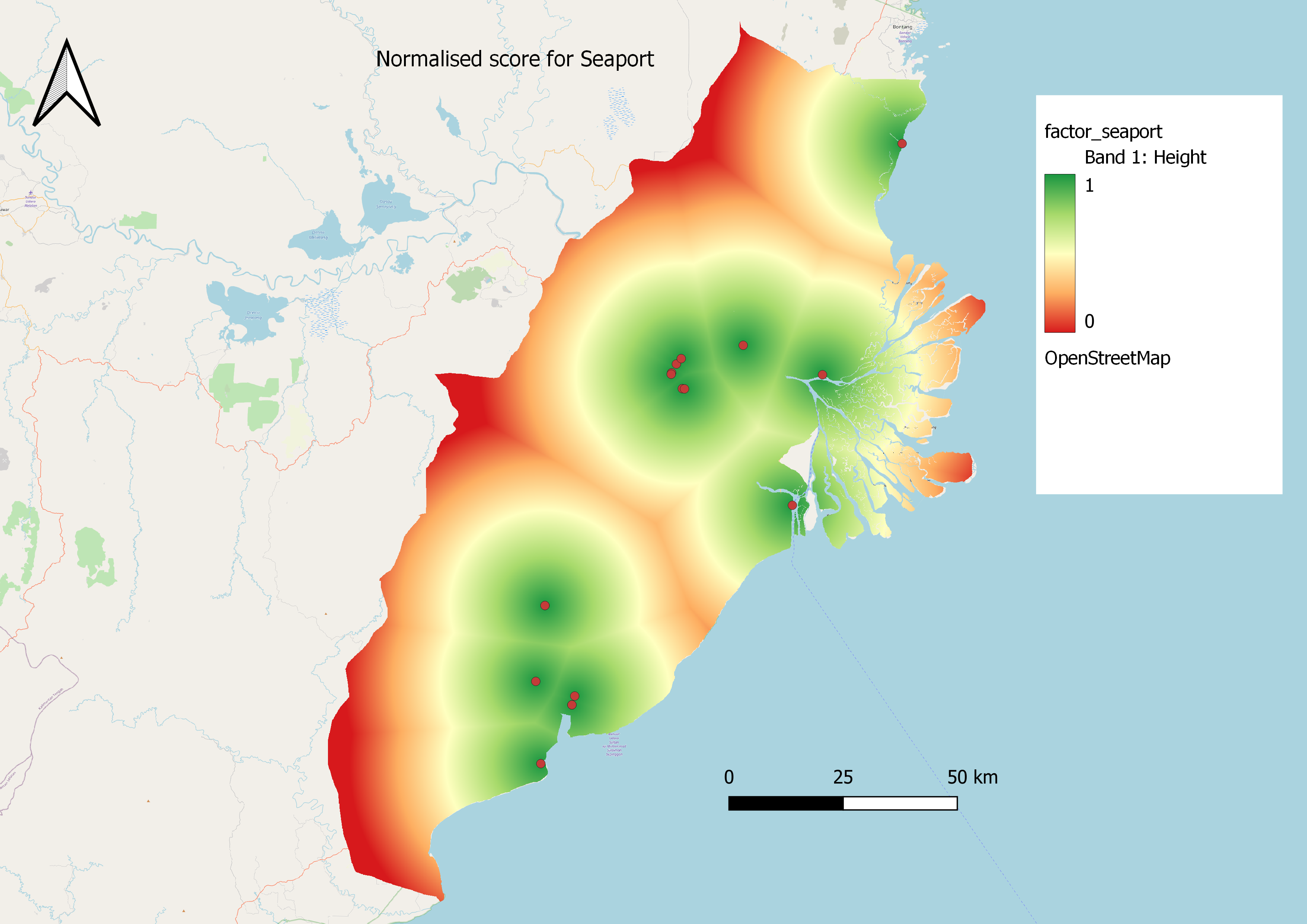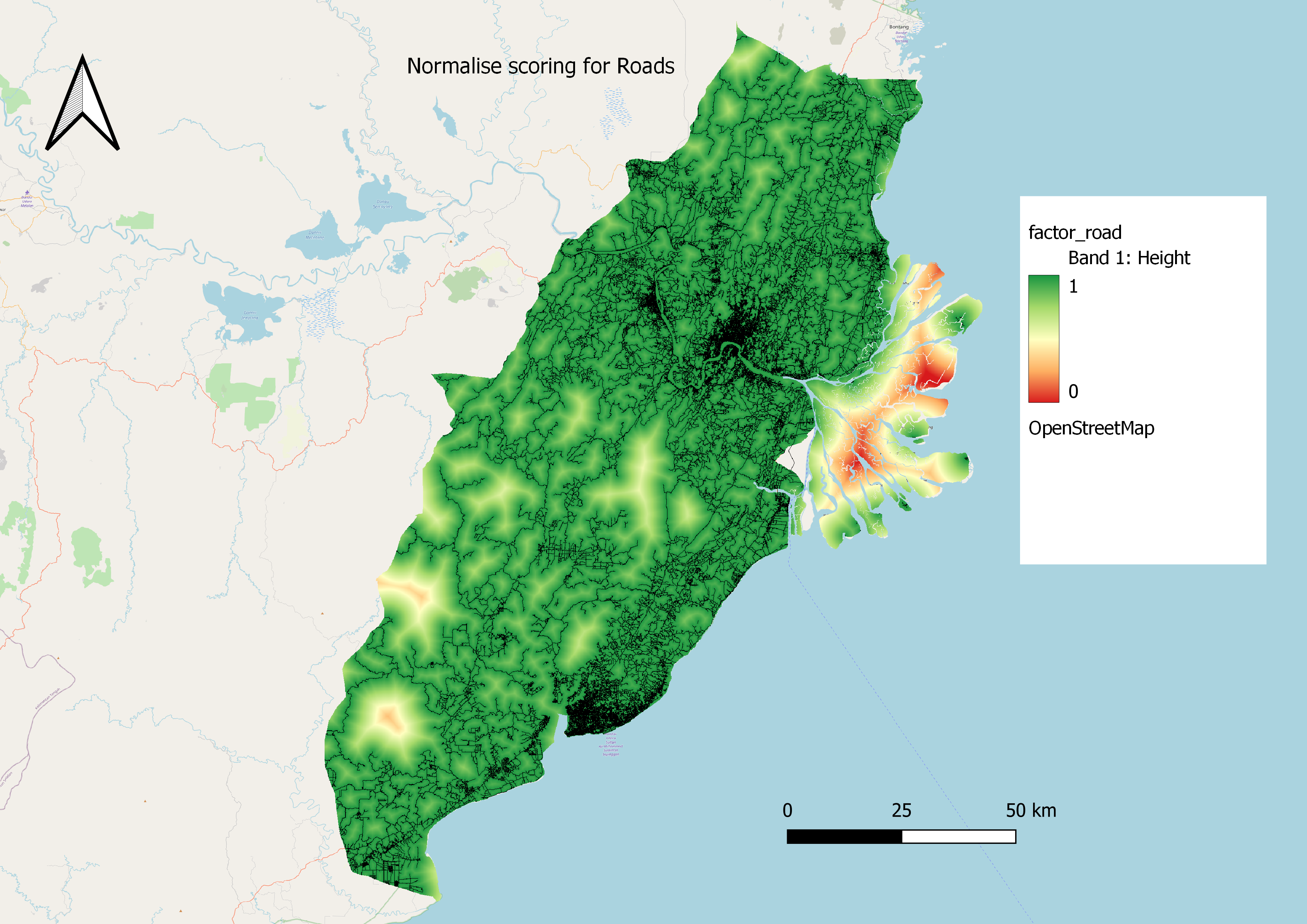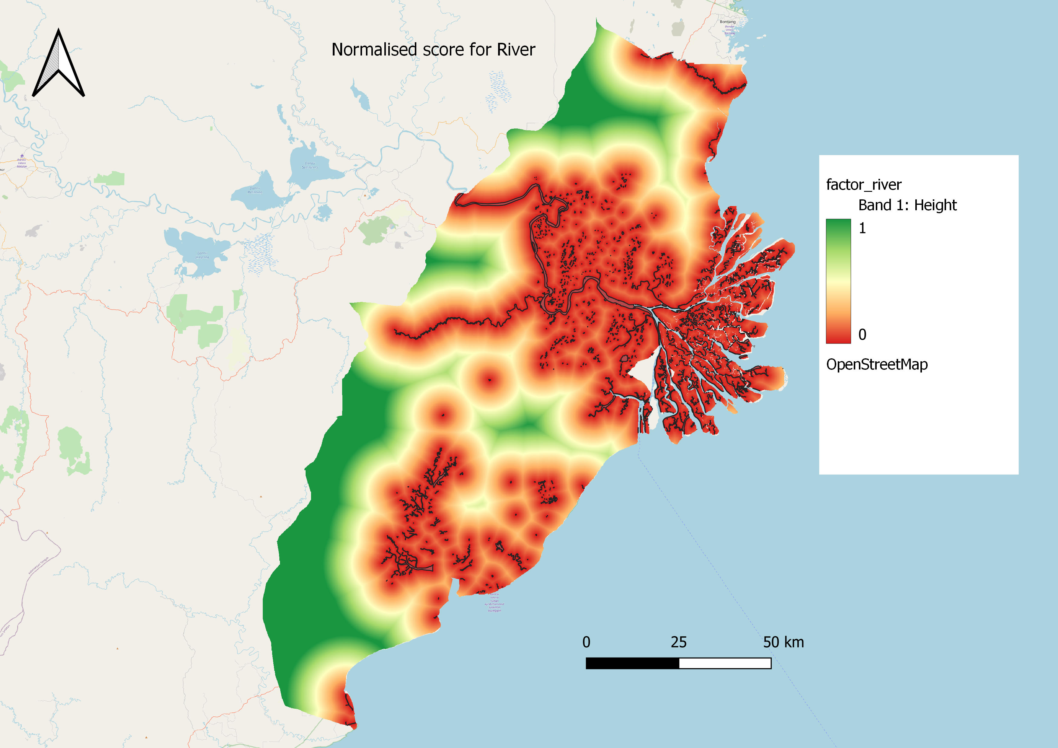 As we are unable to build exactly on the urban settlement, the region that is exactly on the settlement is classed as 0. Increasingly, it is obvious that most areas of the map score higher than 0.5, due to their proximity to the large cities of Balikpapan and Samarinda with the suitability falling as the distance increases.