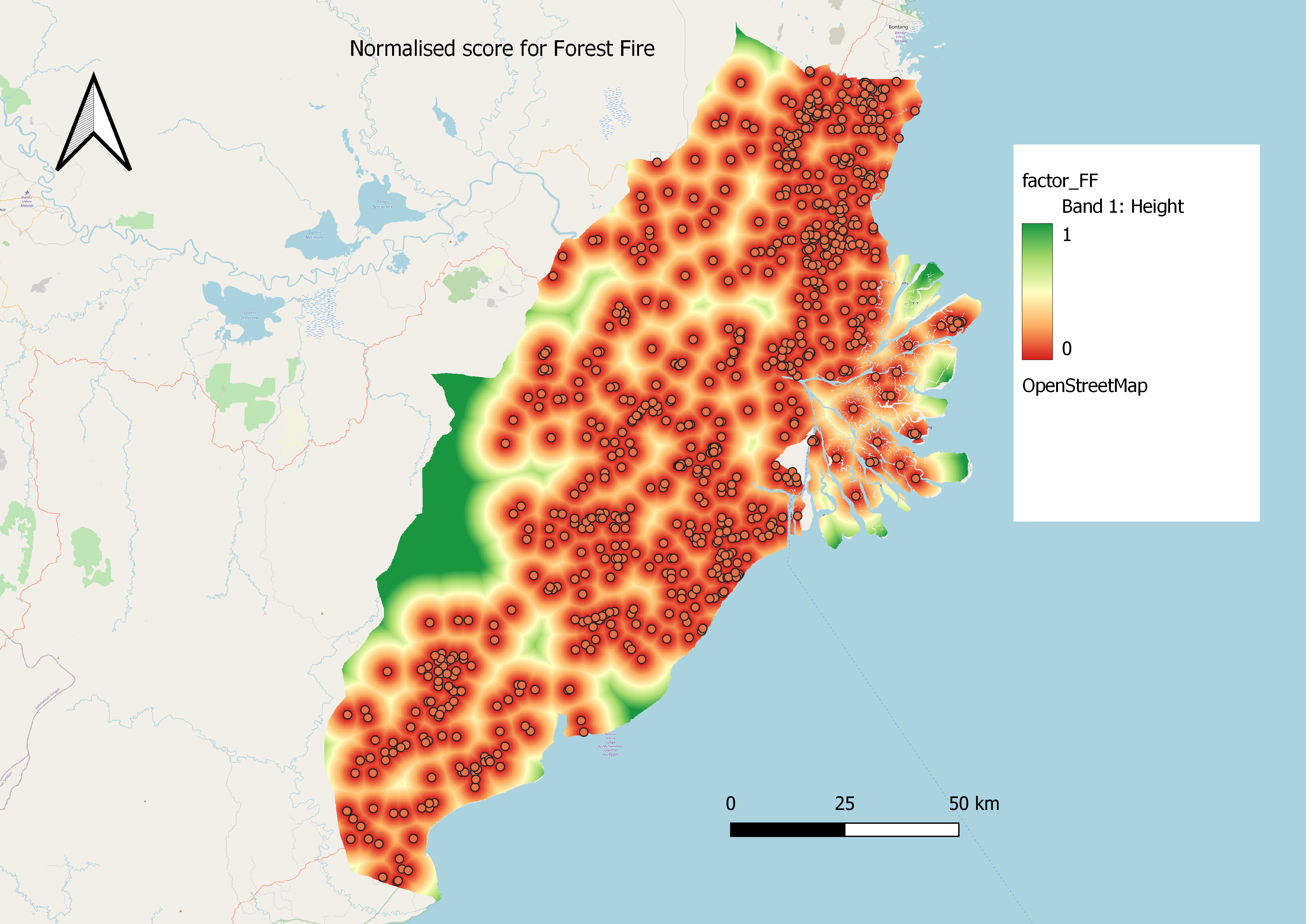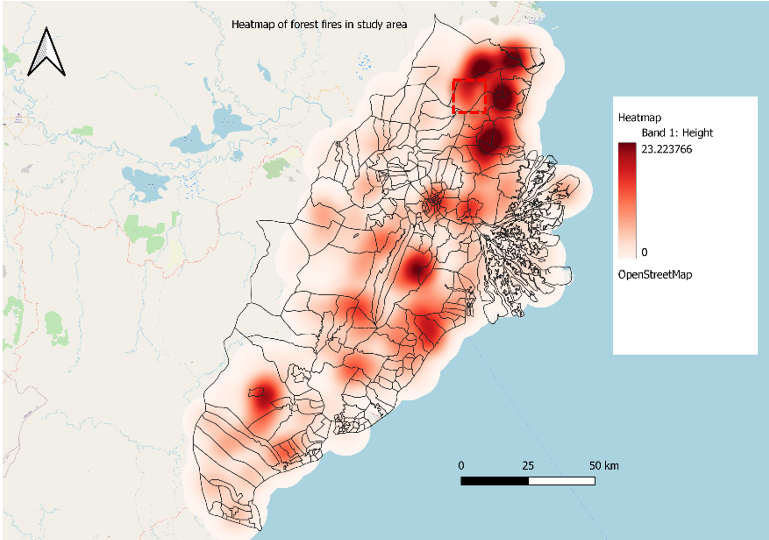 While the study area has many occurance of forest fires, we avoided the darkest shade in our selection in order to reduce the risks of potential forest fire. Our selected site however has encompass nearby frequent forest fire however, it would not be the case once you build the capital there which reduces the forested area and hence reducing forest fires.