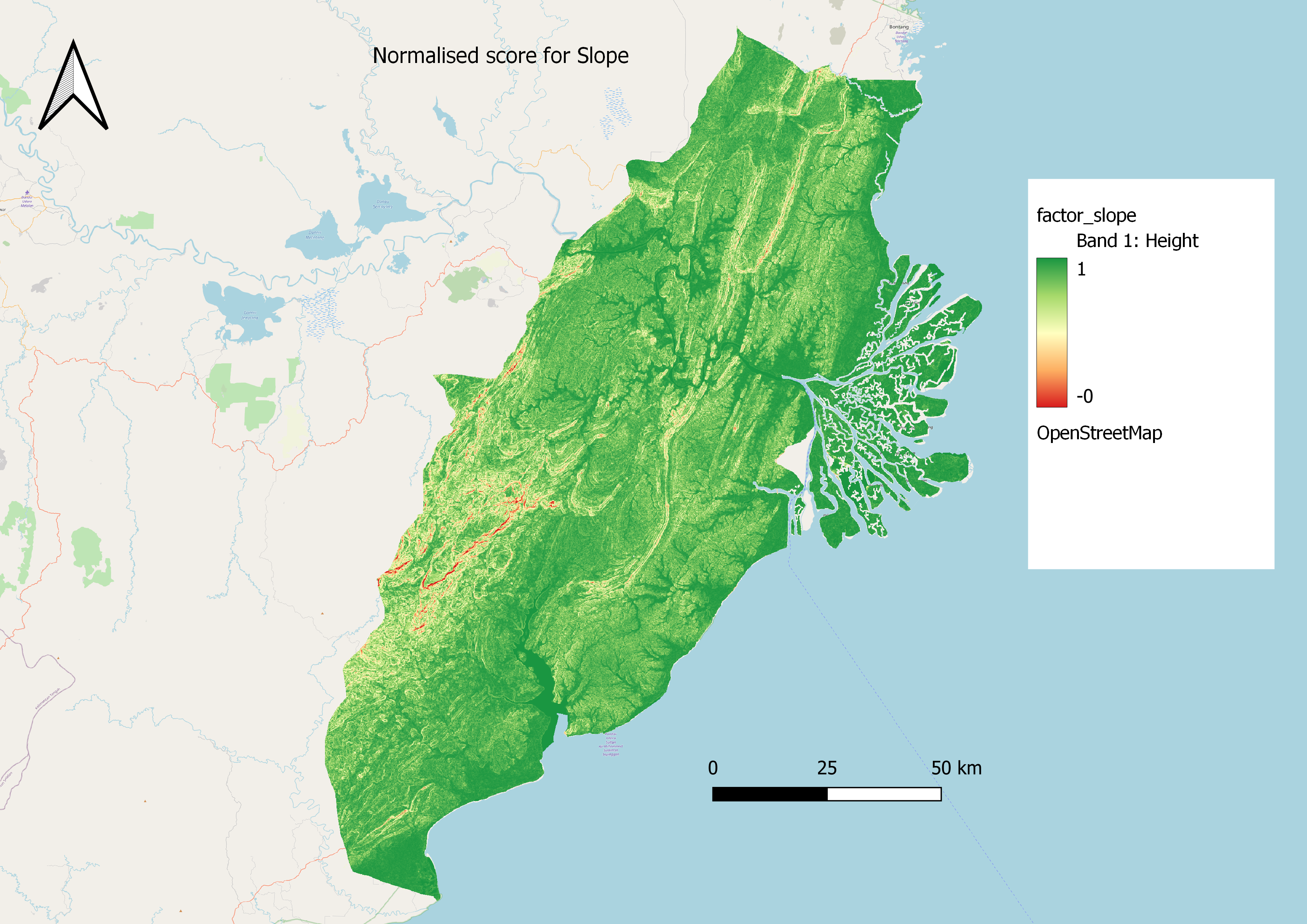 Most of the terrain is rlatively flat and thus scores very well. Looking to the southwest of the map, there are a few areas that are deemed more unsuitable because of the hilly terrain, as further inland west into the study area, it starts to get into mountaineous territory. As it is linked to an increase in construction costs, this area might a potential concern.