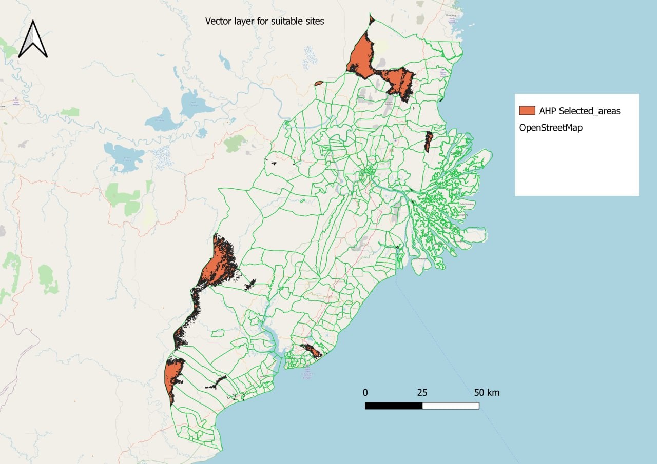 Based on the analysis, several areas, mostly clustered around the regions in the north and southwest, have been identified as suitable locations. Based on a threshold value of 0.6 as acceptable, the suitable sites are outlined in green.