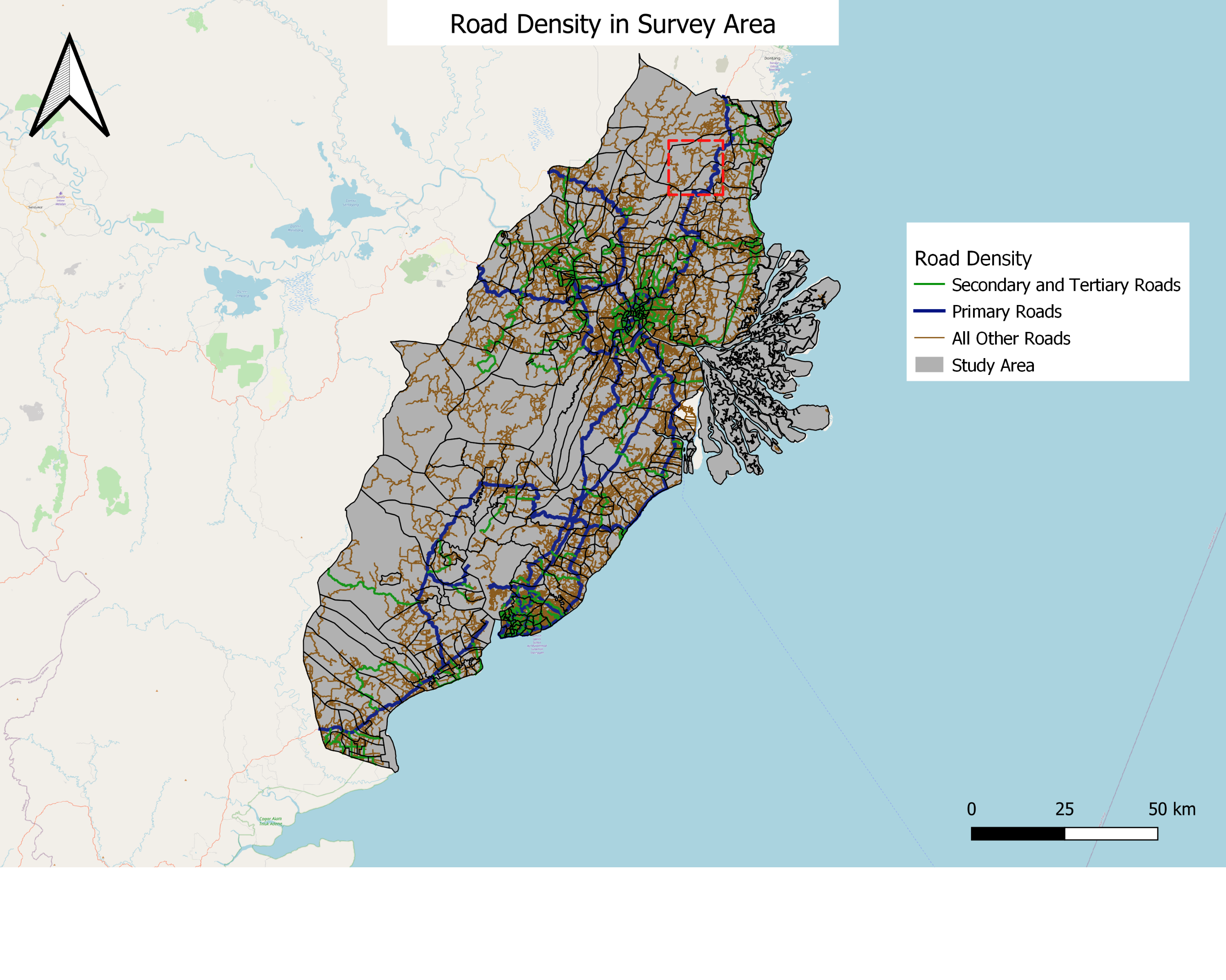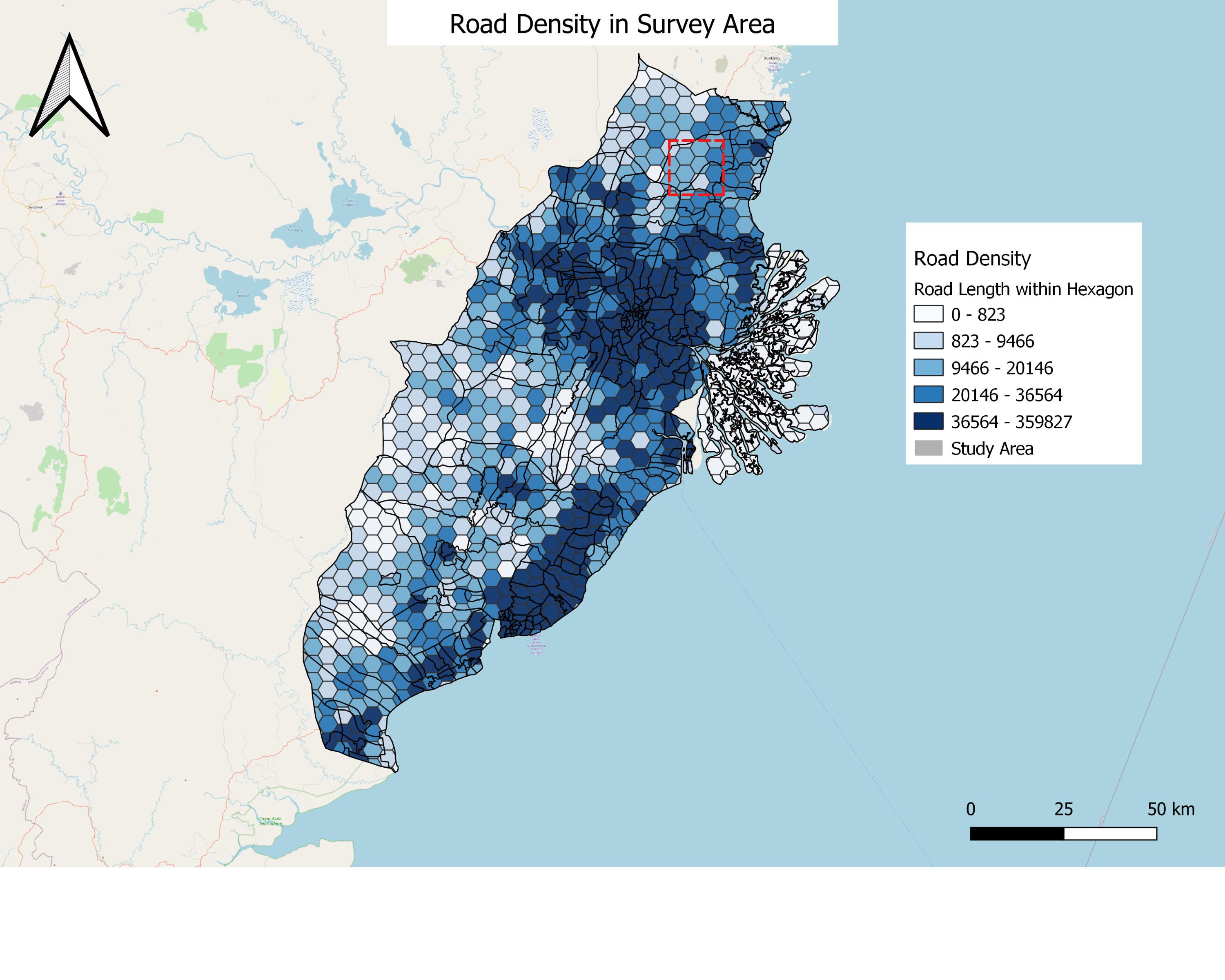 Most areas score well on this, because of a wide variety of roads tht can see further development to support the capital city. Again, the exception is in the more mountaineous regions in the Southwest of the study area, and some regions between Balikpapan and Samarinda.