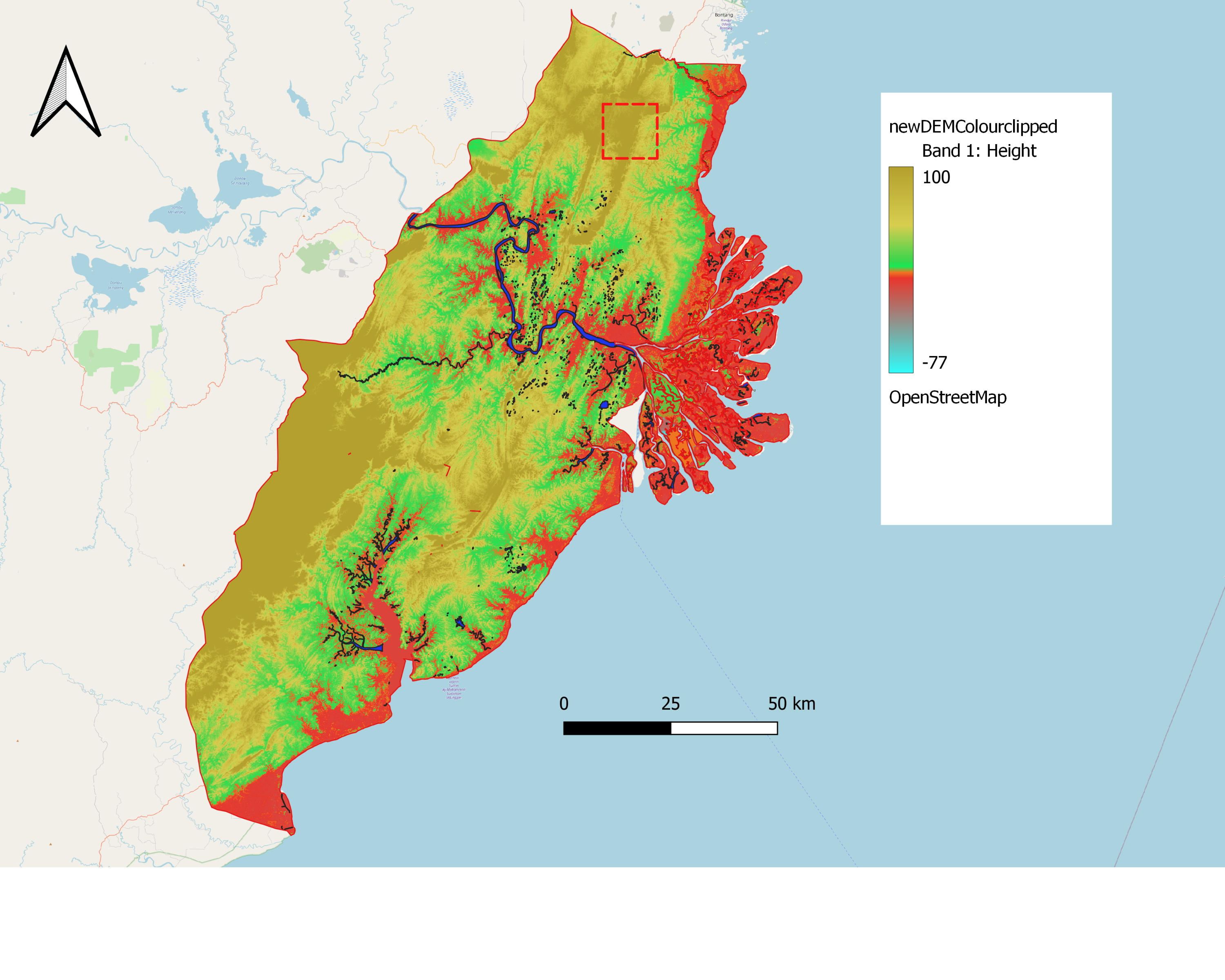 Our selected side further from the coastal areas. It is also far away from major rivers therefore it reduces the risks of natural hazards such as flooding or landslides. We can see that the areas around the lakes and rivers are mostly low-lying with elevation of around 10m. Hence it would be important to choose a site that has a higher elevation.
