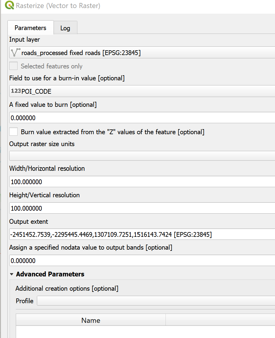 * We use a 100x100m grid. In the window that opens, we set the field to burn-in to POI_CODE, the units to “Georeferenced Units”, and the height and width to 100, as seen below. The layer extent will follow the shape of the study area, with the layer “FinalShape”.