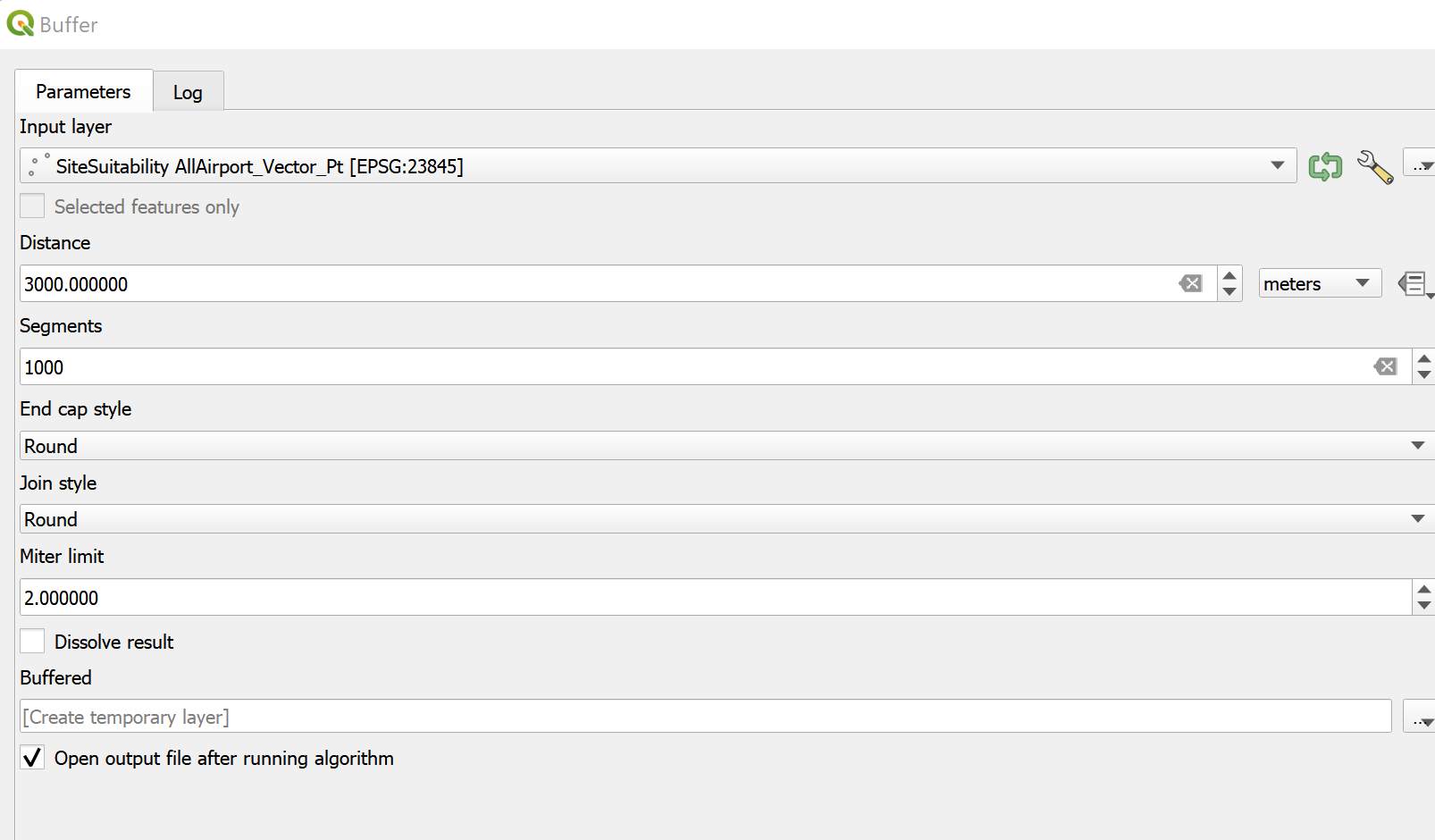 - In the resultant layer, ensure that the distance is set to 3000m, which would create a 3km buffer, and segments is set to 100, which would create a nice curved edge, instead of smaller values which woud result in a rectangle shaped buffer.