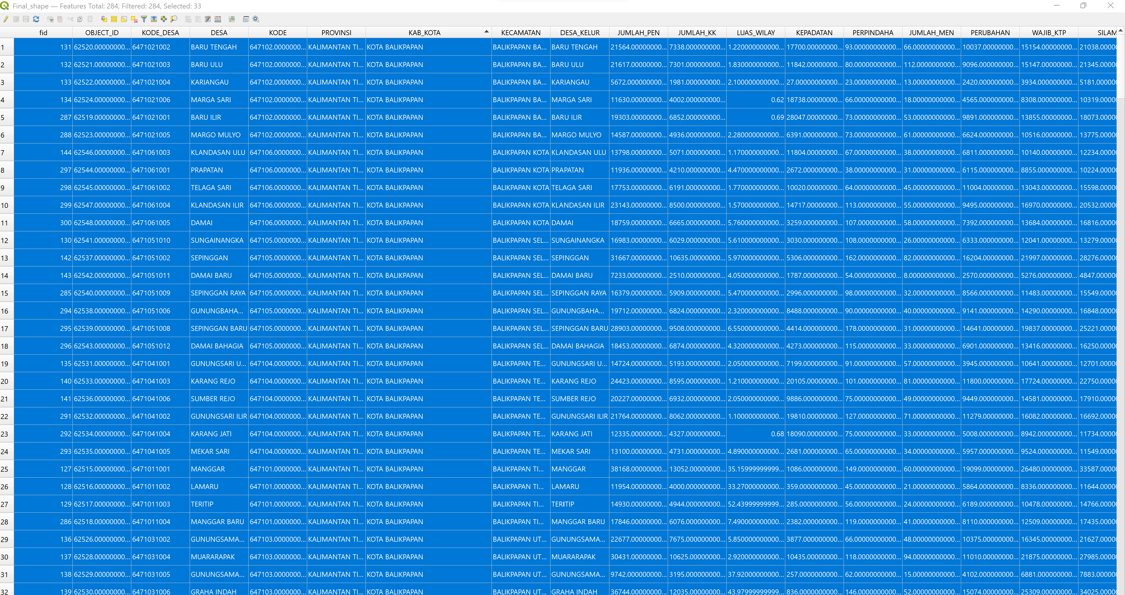 Following that, we sort the table by “KAB_KOTA” by clicking on it, and then selecting all the rows with attribute KAB_KOTA = “KOTA BALIKPAPAN” or “KOTA_SAMARINDA”.