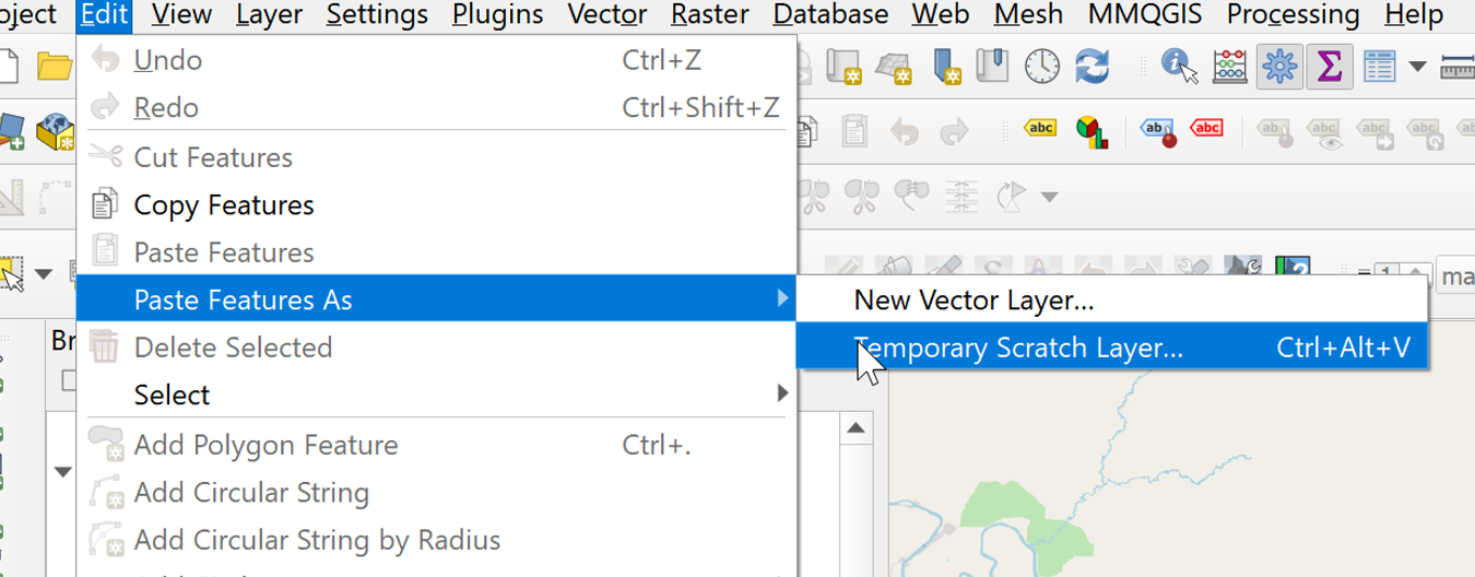 - We paste the features in a temporary layer by going to Edit > Paste > Temporary Scratch Layer.