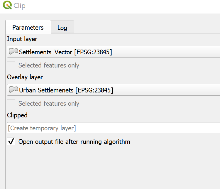- We then go to Vector > Geoprocessing > Clip and select the temporary layer with the city limits as the overlay layer, and the urban settlement layer as the input layer.