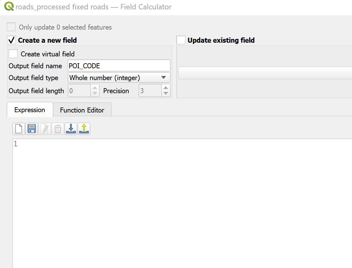 - In the window that opens, make sure ‘Create a New Field’ is selected. Enter “POI_CODE” into the field name and 1 into the box with the values. Then create the field by clicking on “Run”.